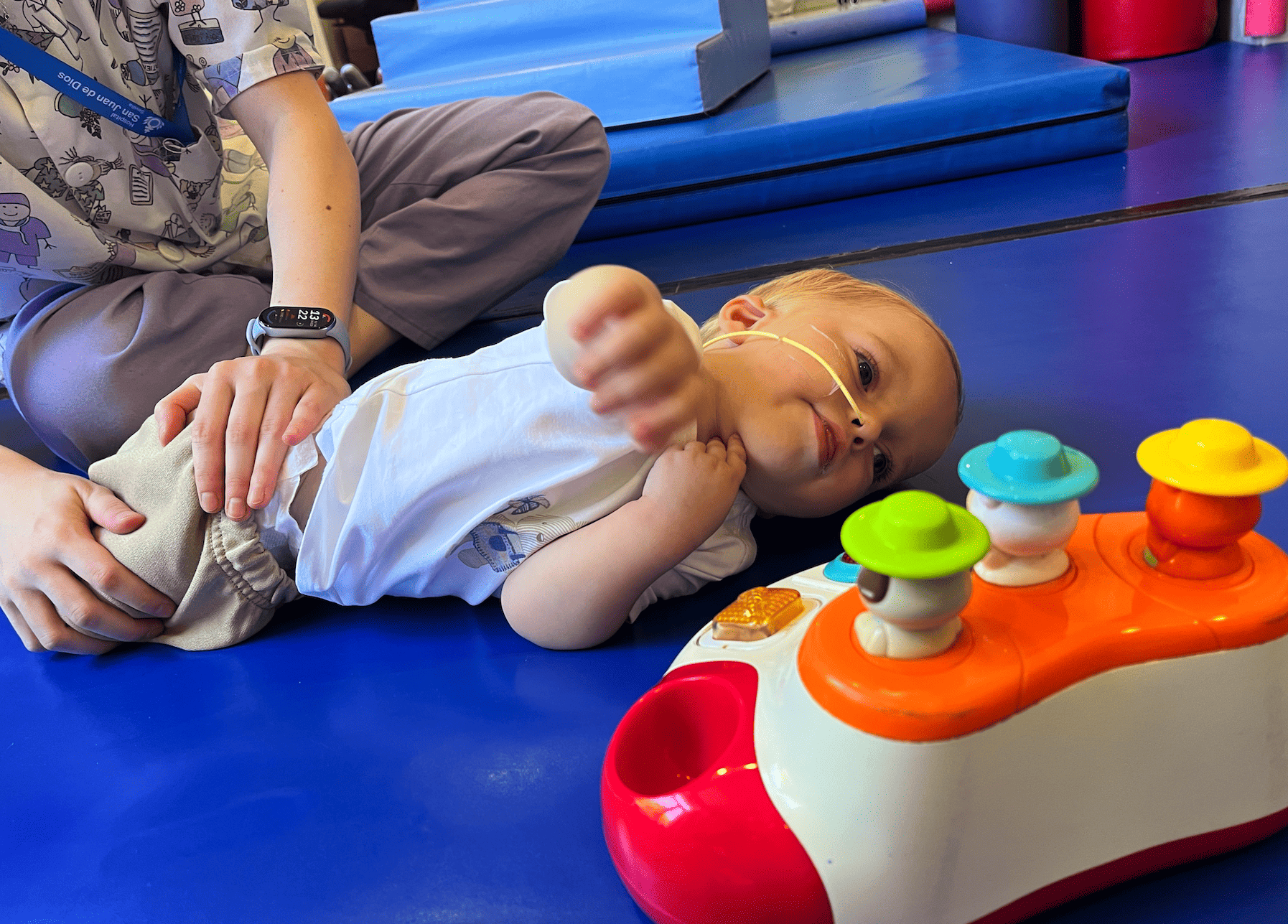 Así que por aquí os dejamos un día más de nuestra vida, en el fisio, de ejercicios y de pasarlo bien. Aquí lo tenéis dándolo todo por coger ese muñeco, interactuar con el juguete para conseguir que se mueva y suene un sonidito, por moverse un poquito mejor.